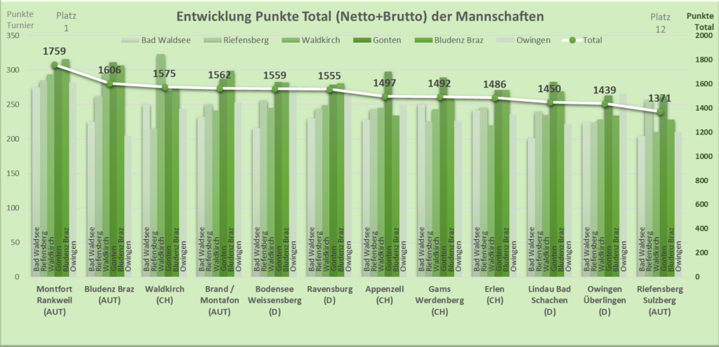 Die Mannschaftswertung besteht aus der Summe der besten 5 Brutto- und der besten 5 Nettospieler eines Turniers. Die bisherige Wertung bestand aus den besten 5 Brutto- + Nettospielern. Also das Gleiche nur in einer Person konzentriert. Da gleichzeitig die Größe der Mannschaft von 9 auf 12 erhöht wurde, war es nicht mehr möglich die vorhandenen Excel-Tabelle zu benutzen. Die Auswertung wird von den jeweiligen Sekretariaten durchgeführt und durch den GC Rankweil fortgeschrieben.
